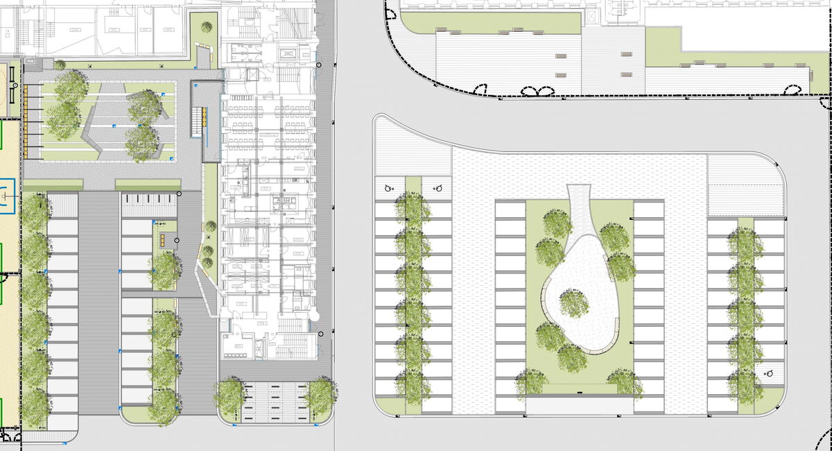 Das Integrierte Verwaltungszentrum wird erweitert und soll den Behörden von BAMF und LDS ein neues Dach über dem Arbeitsplatz bieten. Um eine gestalterische Einheit zu bilden, führen wir die Form- und Materialsprache weiter und setzen dennoch eigene Akzenkte. Als einziger Abschnitt der neuen Zentralen Ausländerbehörde öffnet sich der Haupteingang zum öffentlichen Raum und wird dafür mit besonderen Materialien und einer großzügigen Gestaltung belohnt. Später wieder unter den Oberflächen versteckt, aber für die Funktion wichtig, werden die Ver- und Entsorgungsmedien einschließlich der Regenrückhaltung ertüchtigt und umgebaut.