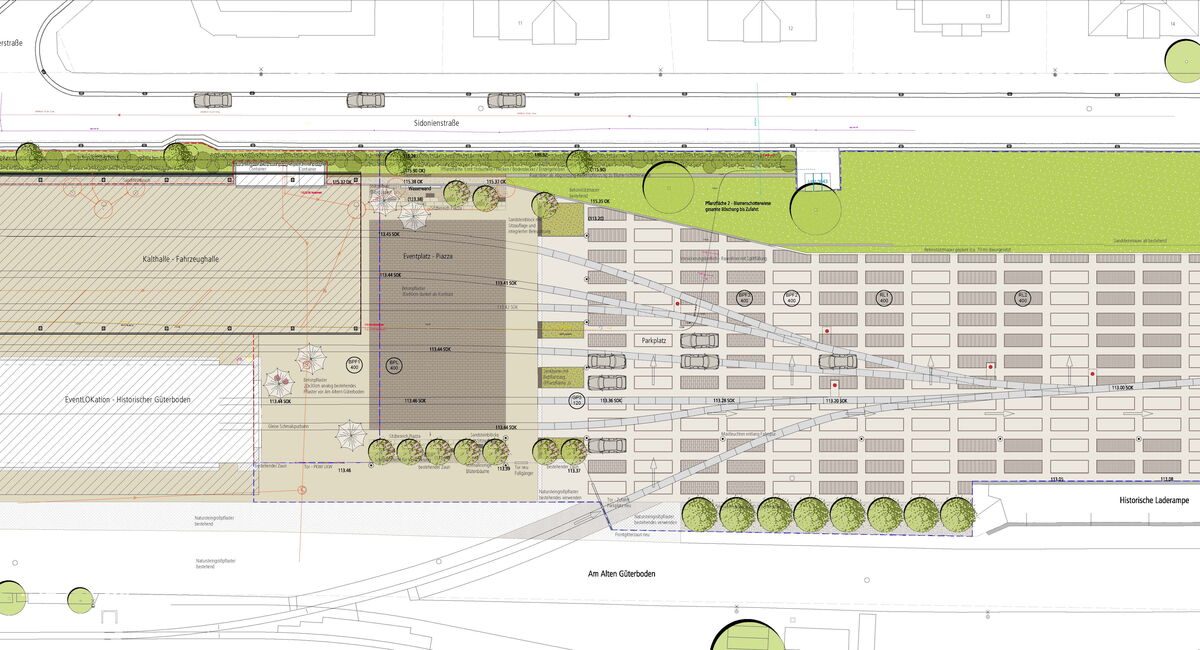 Eine nicht alltägliche Aufgabenstellung. Auf einem Freigelände des Tagungszentrums der Sächsischen Wirtschaft (TSW) und der Eventlocation ‚Güterboden‘ sollen die für ein Eisenbahnmuseum genutzten Flächen in eine Aufenthalts- sowie Veranstaltungsfläche und einen Parkplatz umgestaltet werden. Die Entwurfsidee legt sich wie ein Tuch über die gesamte Freifläche mit seinen verschiedenen Nutzungsbereichen. Technisch anspruchsvoll ist die Pflasterung zwischen den Gleisen und die Einbeziehung der eisenbahnnotwendigen Ausstattungen.
