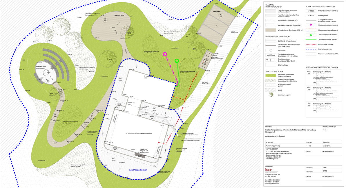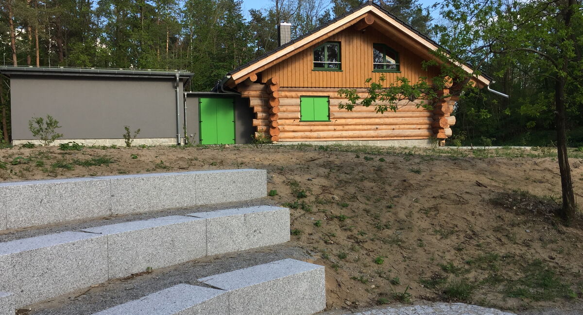 Mitten in der Königsbrücker Heide steht als Ausgangspunkt für Exkursionen in das Großschutzgebiet und als Kommunikationspunkt und Basislager für die Juniorranger eine Wildnisschule in Blockbauweise. Durch natürliche Materialien und durch Ausnutzung der topografischen Gegebenheiten gelingt es, die Außenanlagen mit Terrassen, Wegen, Kommunikationsinseln und einem Amphitheater in den Naturraum einzubinden.