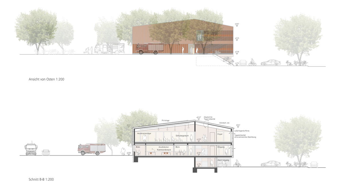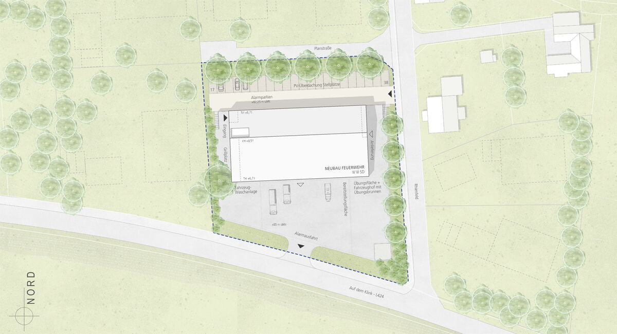 Für einen Feuerwehrneubau der Stützpunktwehr Börry in Emmerthal/ Niedersachsen wurde ein nichtoffener Realisierungswettbewerb durchgeführt. Das Grundstück für den geplantes Feuerwehrneubau liegt am Ortsrand von Börry und weist in Nord - Südrichtung einen Höhenunterschied von ca. 2,5 - 3,0 m auf. Ziel unseres Entwurfs ist es, diesen natürlichen Geländeverlauf und seine dreiseitige Anbindung an vorhandene Straßen und Wege möglichst wenig zu verändern. Unser Entwurf nutzt den Höhenverlauf für eine funktionale und wirtschaftliche Lösung. Wir baue " mit dem Gelände".