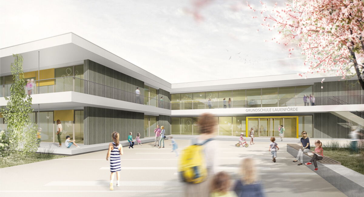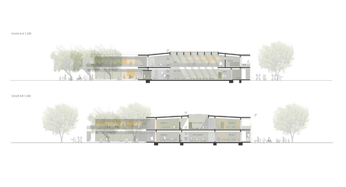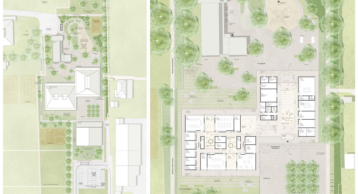 Der Neubau der Grundschule im Grünen schafft die funktionale Verbindung der vorhandenen Turnhalle und Mensa/Ganztagesbereich. Zwei versetzte Baukörper bilden unterschiedliche Außenbereiche für Vorplatz, Pausenhof, grünes Klassenzimmer und Schulgarten. Beide Baukörper, über einen „Gelenkpunkt“ verbundene Baukörper stehen in Korrespondenz zueinander und zu den bestehenden Gebäuden. Wir wollen den Gebäudebestand ergänzen und so ein attraktives Ensemble mit vielfältig nutzbaren Außenbereichen entwickeln. Die von uns vorgeschlagene Architektur soll die Qualitäten der Lage stärken und ein Konzept für ein zeitgemäßes, zukunftsorientiertes Haus für die Kinder und Jugendlichen anbieten.